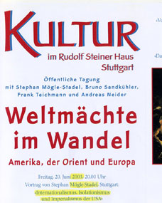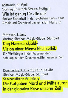 ![]() Plakat (Link) zum Dag Hammarskjöld Vortrag 2005 in der Filderklinik bei Stuttgart Historisches Doku. Brief AAGAH |