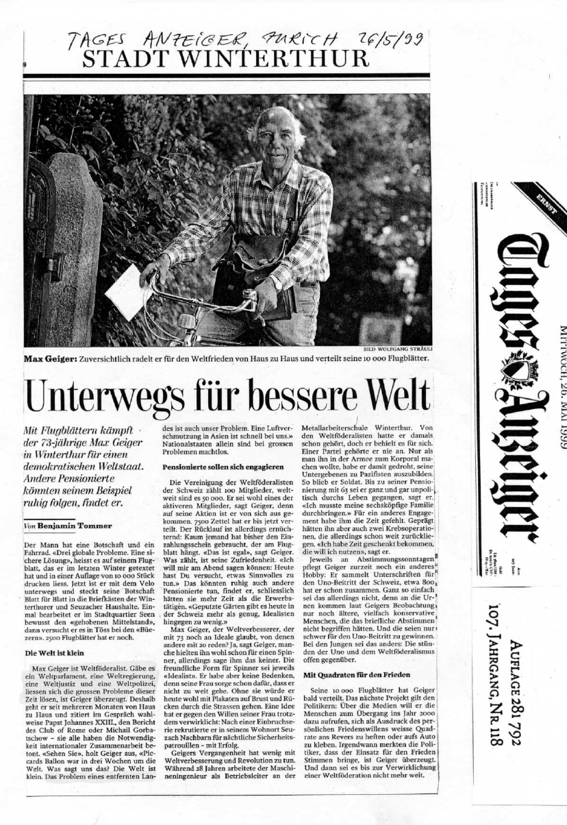 Max Geiger ist langjähriges Mitglied der Weltbürger und Weltförderalisten-bewegung und beweist immer wieder, dass man auch als soge. "Kleiner Mann" einiges bewegen kann.