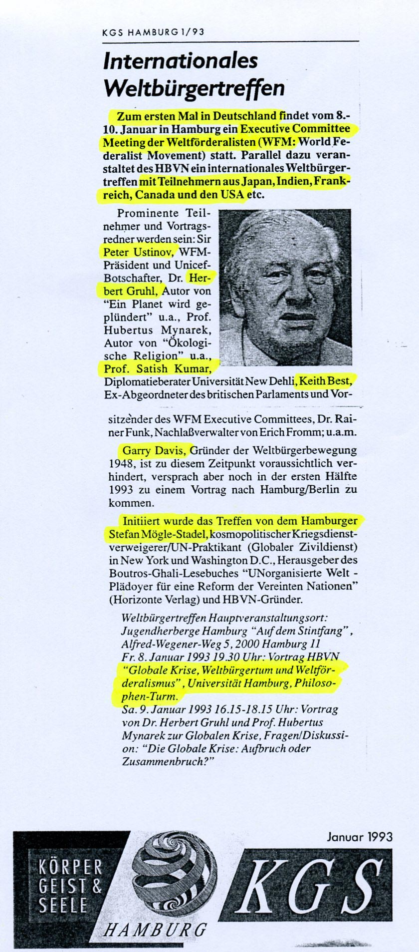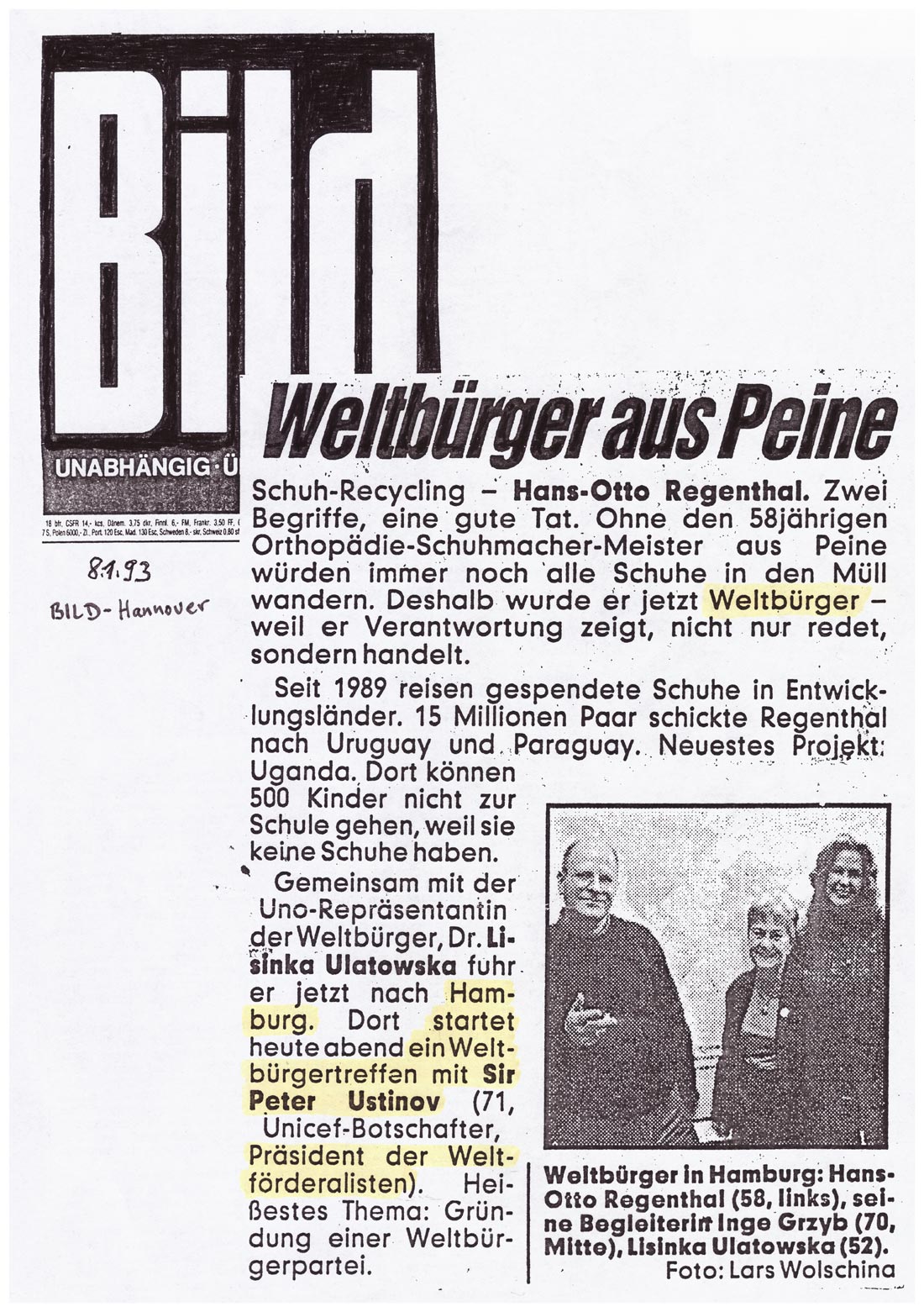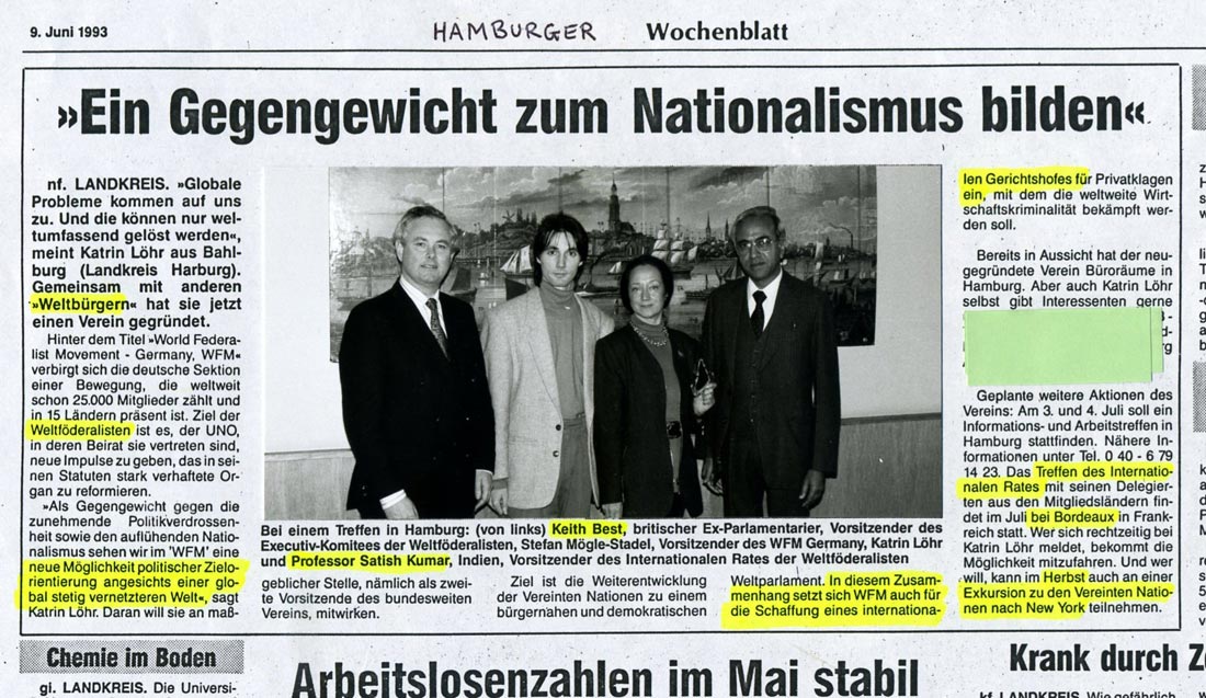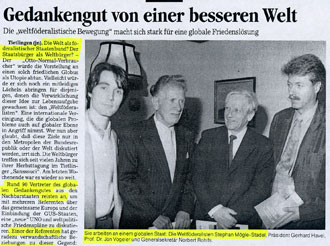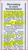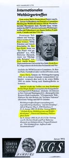 Bericht über den Besuch des entwicklungspolitischen engagierten Schumachers Hans-Otto Regenthal beim internationalen Weltbürger-Treffen in Hamburg (siehe obiger Artikel).