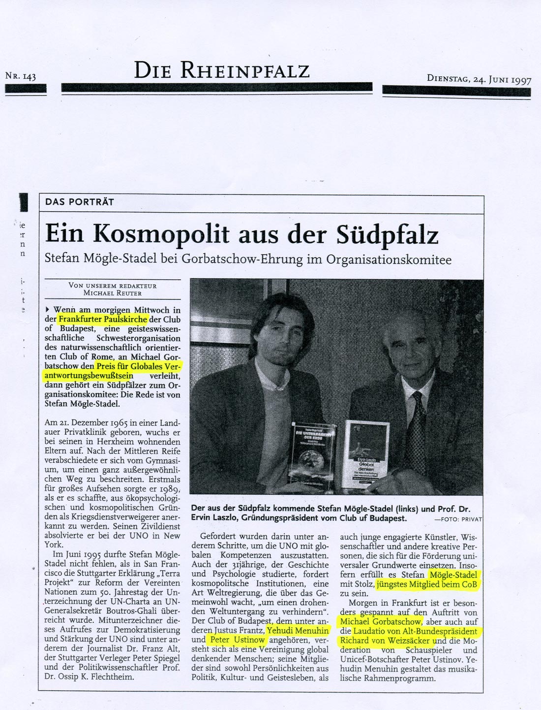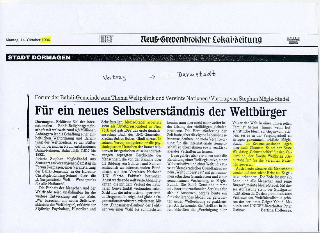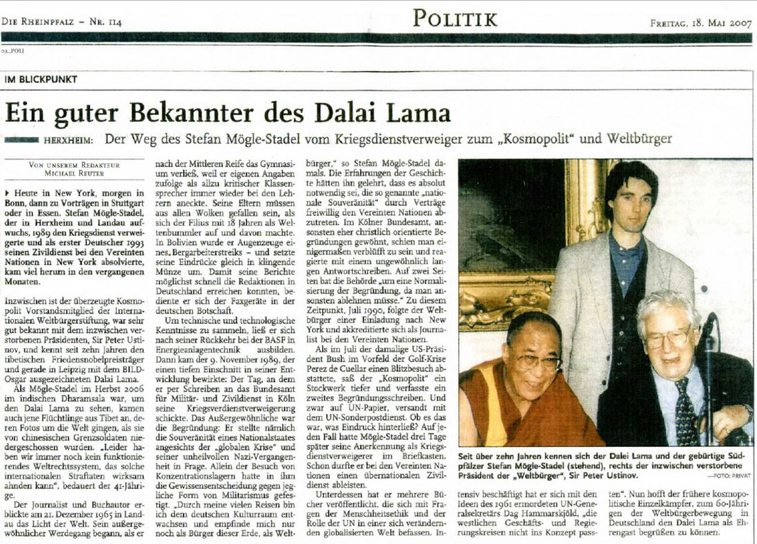 erschienen in Die Rheinpfalz am 18. Mai 2007 Die Bekanntschaft von Stephan Mögle-Stadel, Repräsentant der Weltbürgerbewegung (WCF) für den deutschsprachigen Raum, mit dem Dalai Lama, geht auf das Jahr 1993 zurück. Der Dalai Lama ist Ehrenmitglied der Weltbürger und Besitzer eines Weltbürgerpasses. |  |