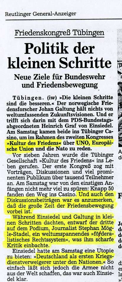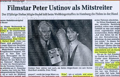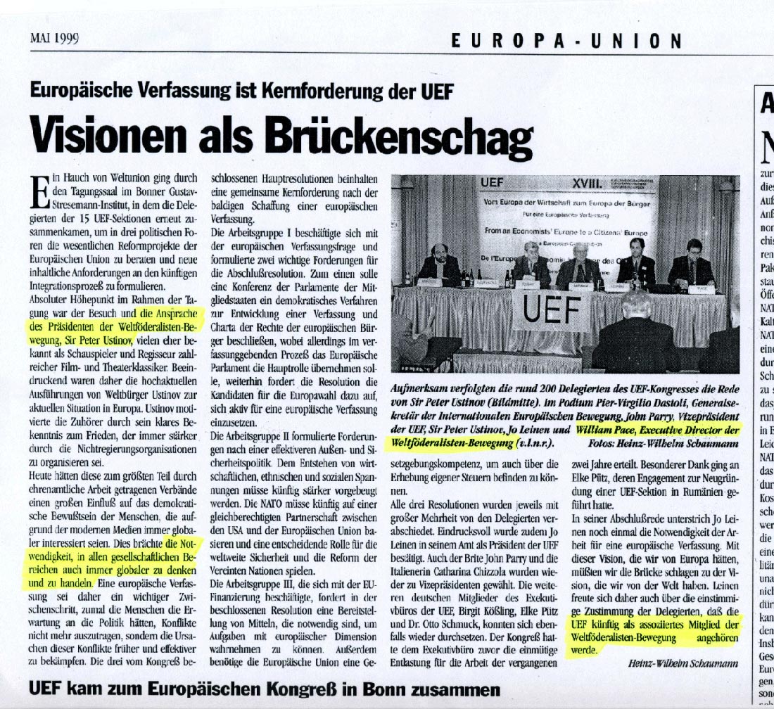 Bericht über eine gemeinsame Podiums-Veranstaltung der United European Federalists (UEF) mit den Weltföderalisten (WFM) Mit auf dem Podium für die Weltbürgerbewegung: Sir Peter Ustinov (damals WFM Präsident) und der damalige Executive Direktor der Weltförderalisten William Pace. |  |