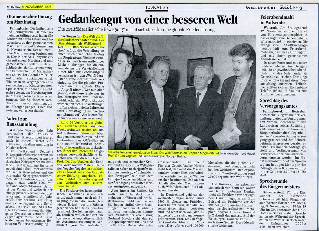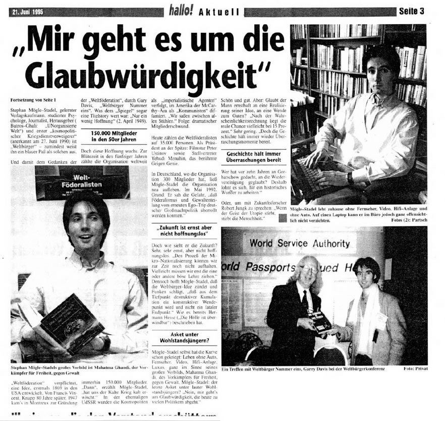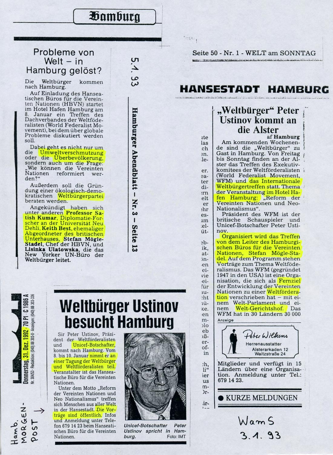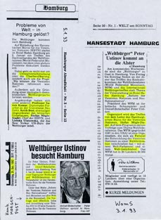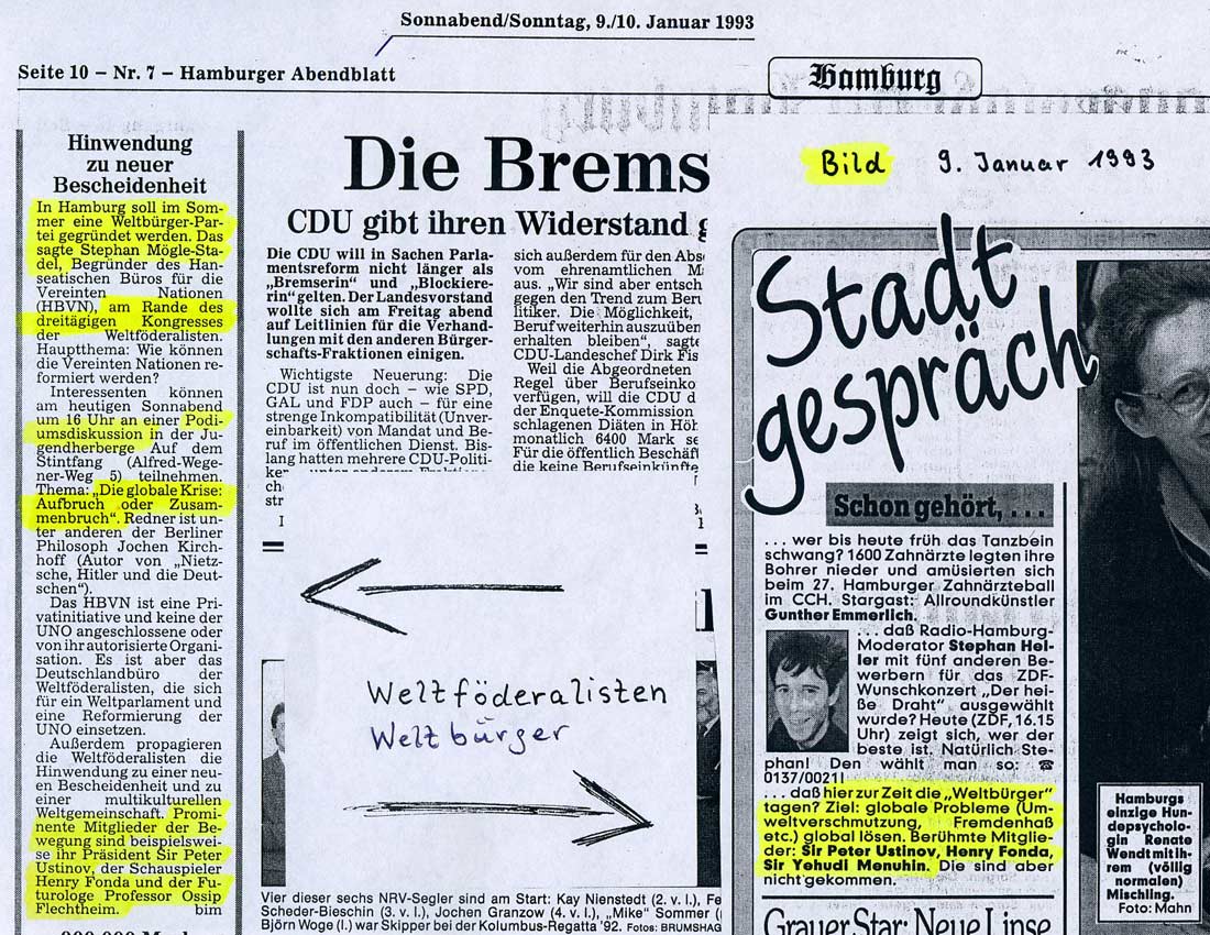 Rechts: Verschiedene Presseberichte über das Internationale Weltbürgertreffen aus WELT am Sonntag, Hamburger Morgenpost u.a. |  |  |