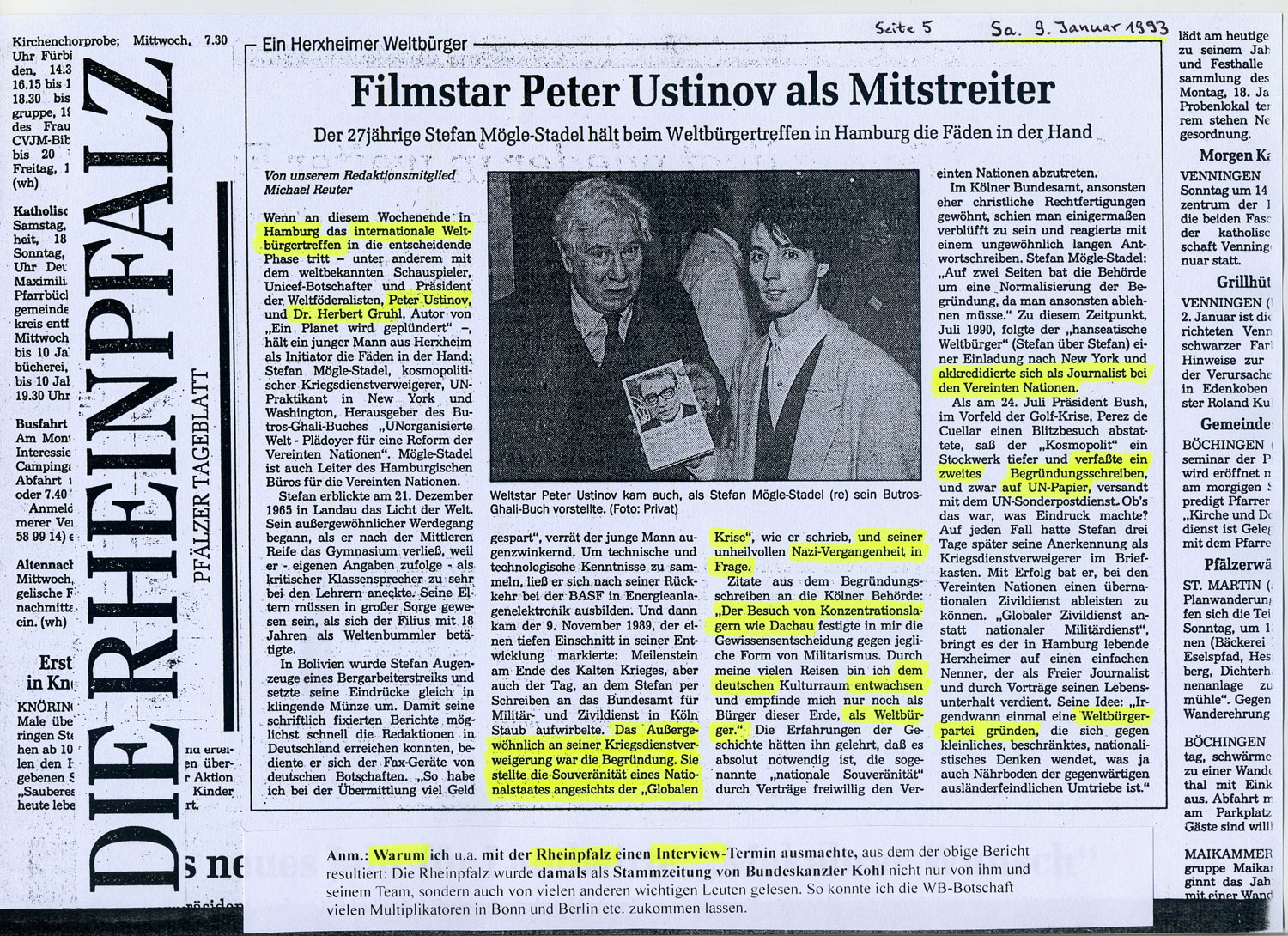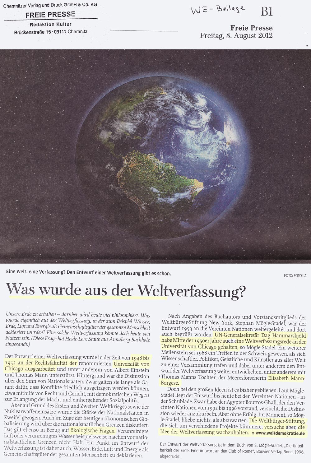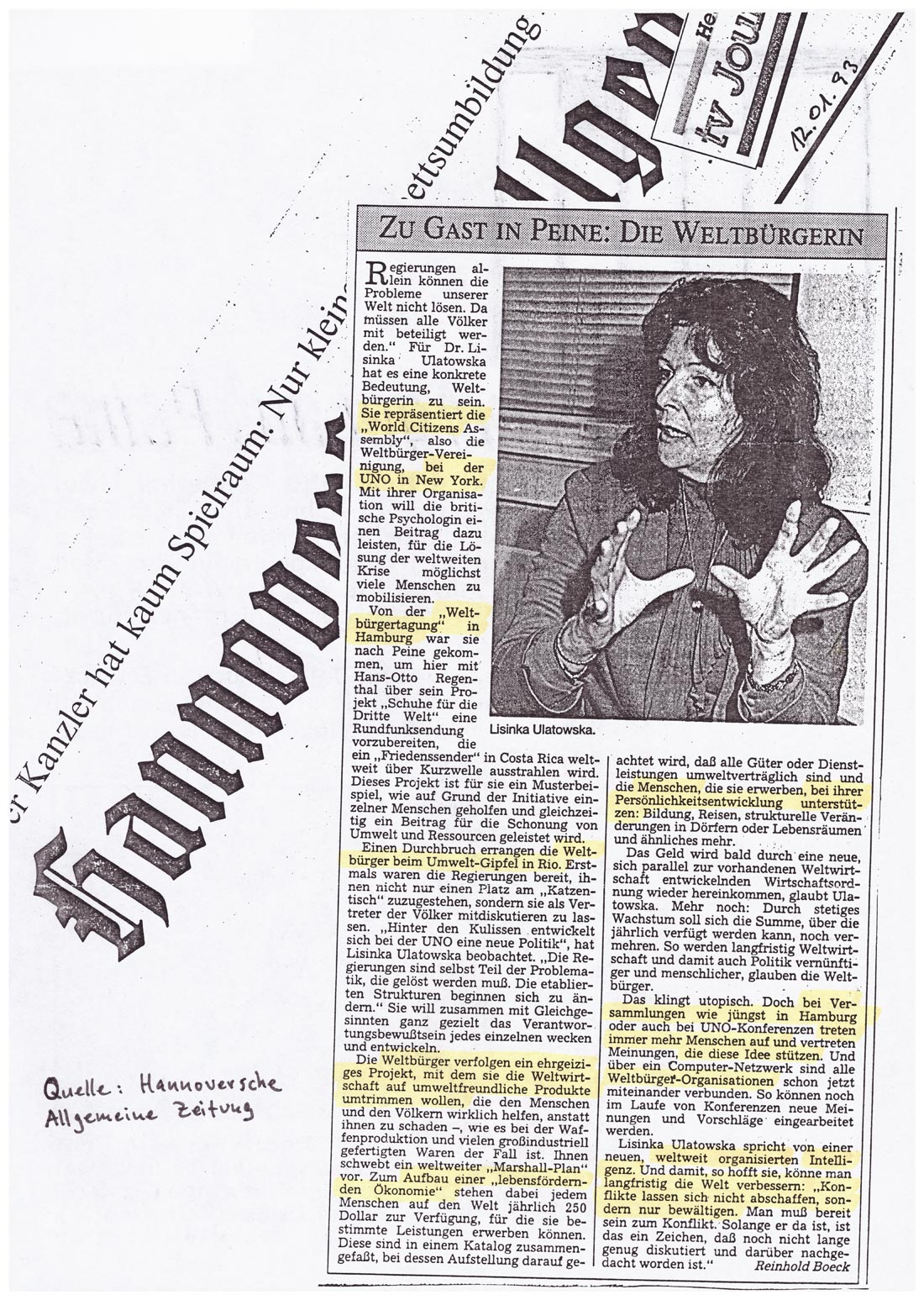 Rechts: Verschiedene Presseberichte über das Internationale Weltbürgertreffen aus WELT am Sonntag, Hamburger Morgenpost u.a. |  |  |