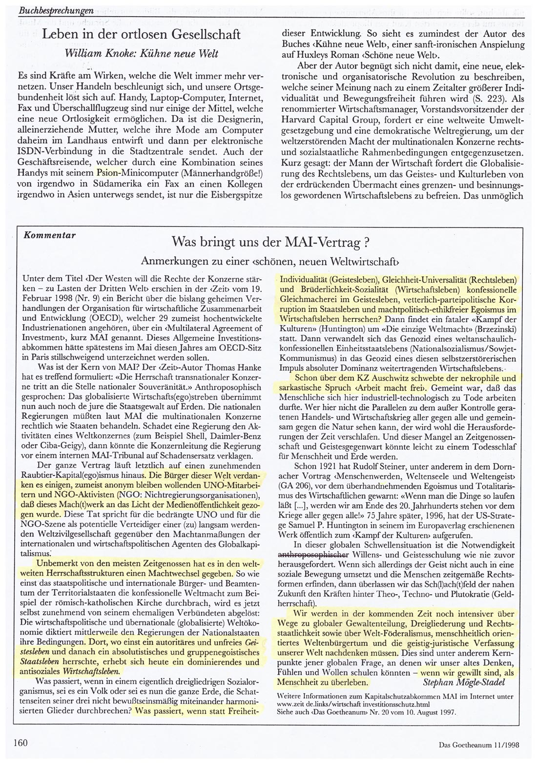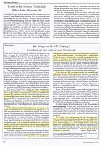 rechts: Kommentar Mögle-Stadel "Was bringt uns der MAI-Vertrag?" vom März 1998 über die Machtübernahme des Wirschafts-Sektors auf der globalen Ebene.