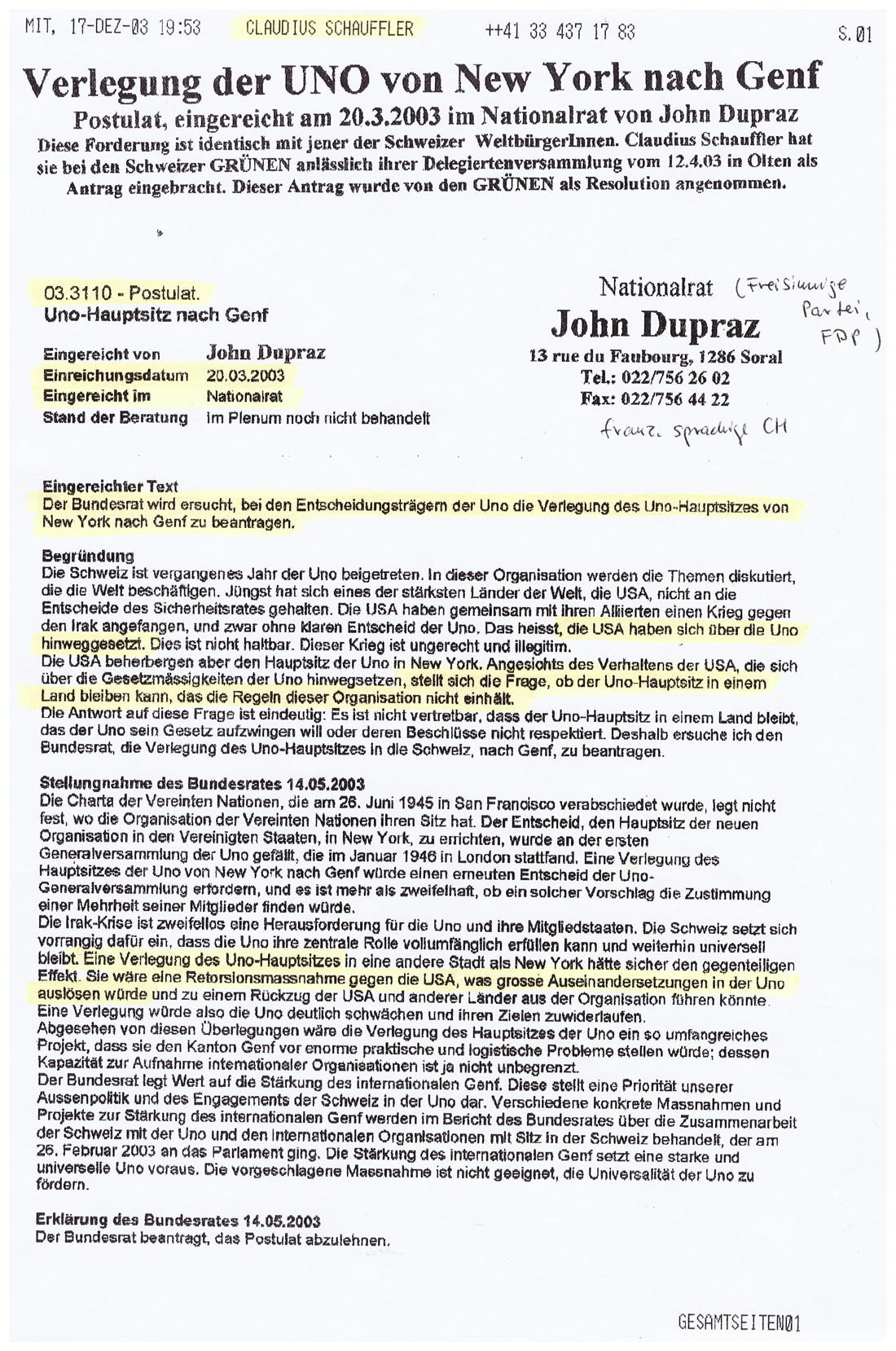 wg. Gefährdung der UNO-Zukunft