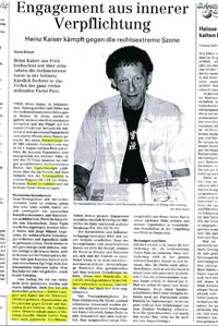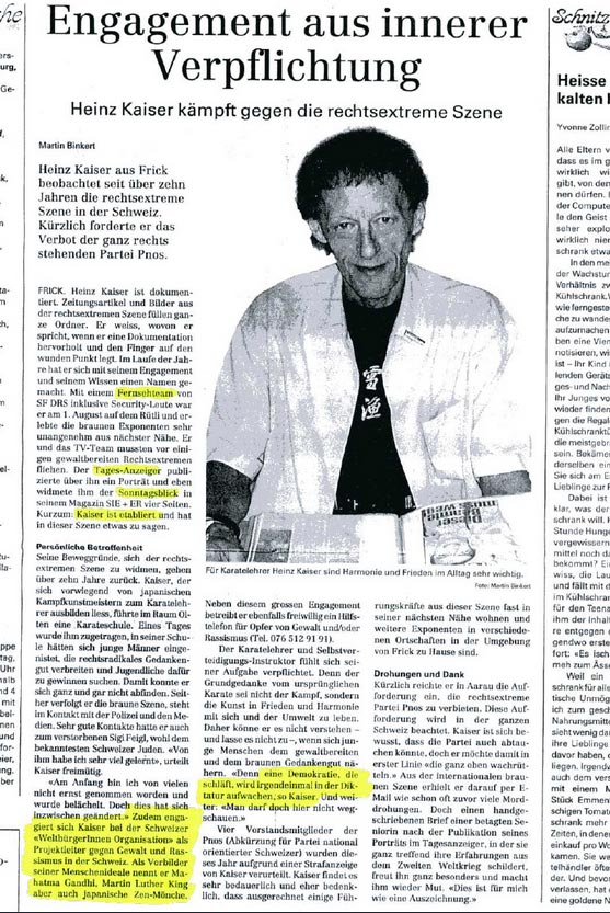 Heinz Kaiser, Projektleiter der Weltbürgervereinigung Schweiz für Antirassismusfragen hat stellvertretend für die Weltbürger die Führungsspitze der "Partei National Orientierter Schweizer" (Tarnorganisation der Neonazis) angezeigt. |  |
