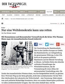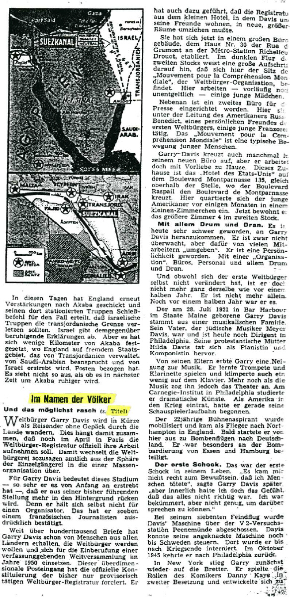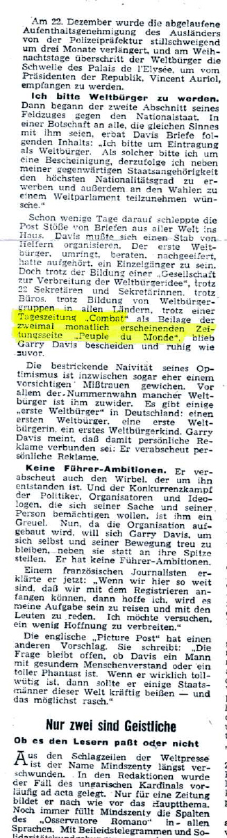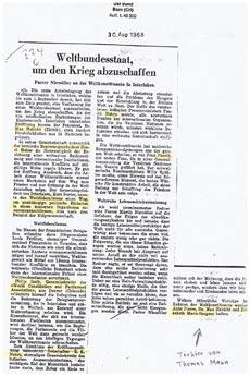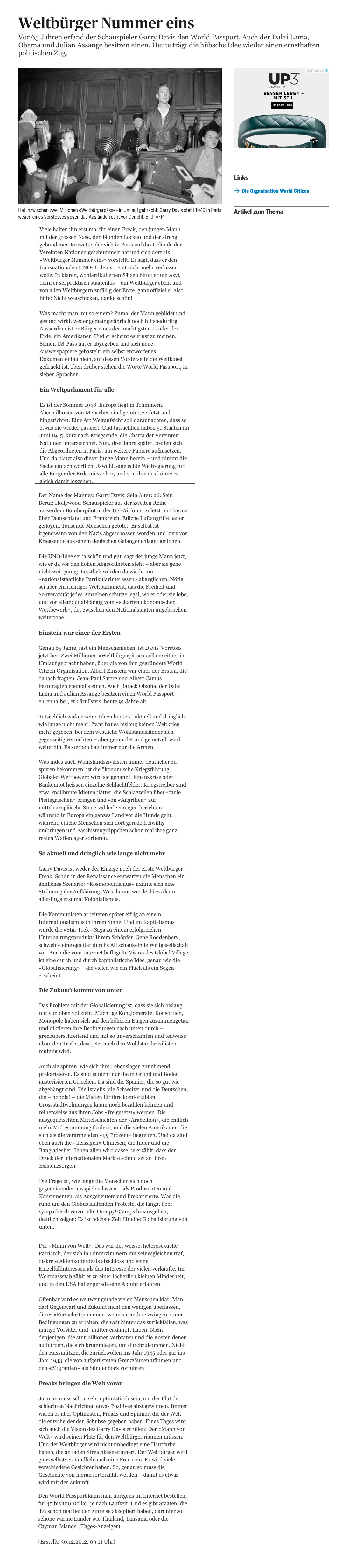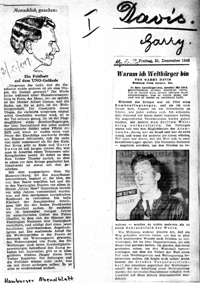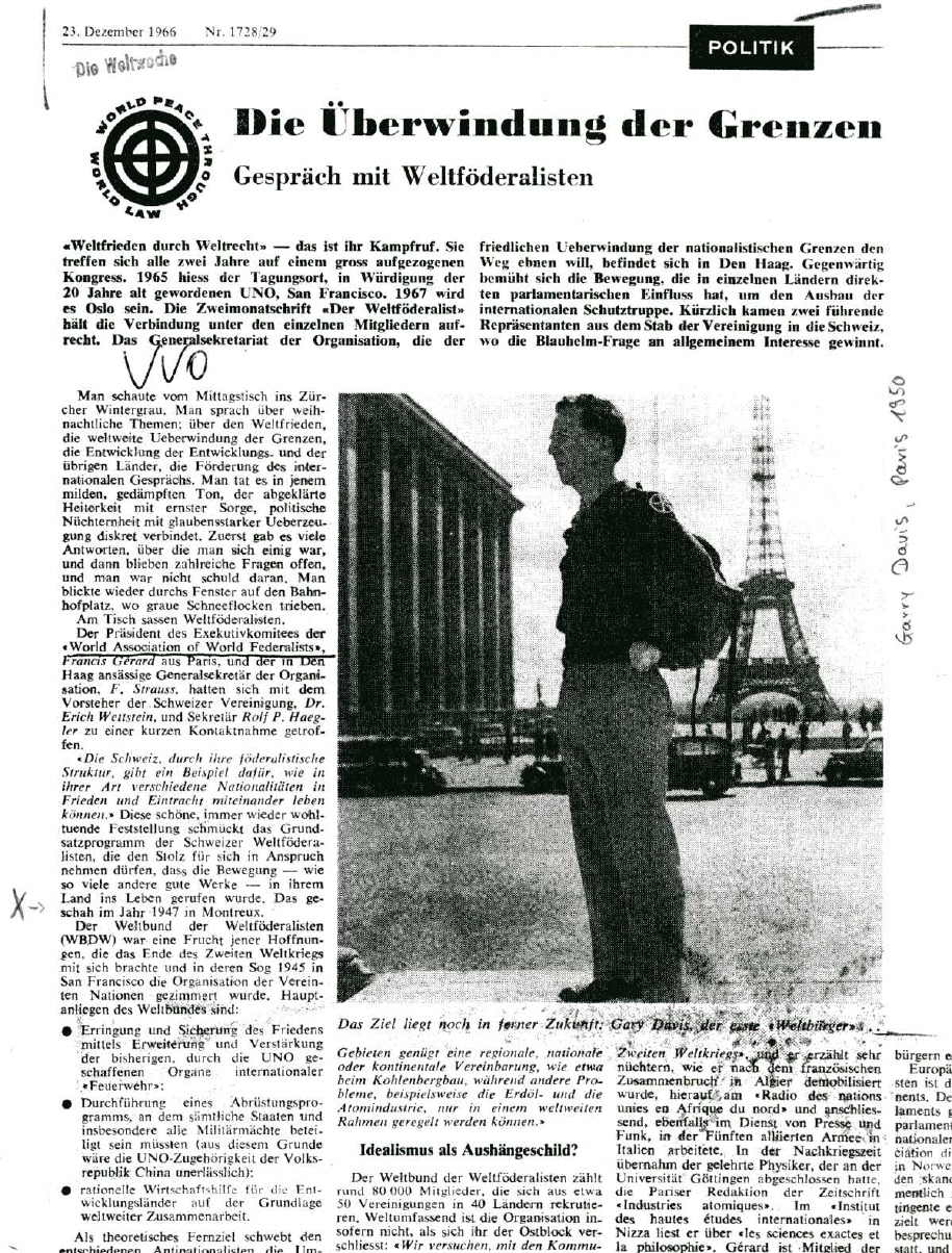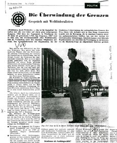 | Thomas Mann: Nur eine Weltdemokratie kann uns retten erschienen in Berliner TAGESSPIEGEL am 01.August 2011 Historischer Rückblick auf die Weltbürger- & Weltdemokratie-Bewegung vom Ende der 40er Jahre des 20. Jahrhundert unter Würdigung der Mitwirkung von u.a. Thomas Mann, A. G. Borgese, Lewis Mumford und Hermann Broch. | "Die Überwindung der Grenzen" erschienen in Die Weltwoche (Zürich) am 23. Dezember 1966 Das Foto unten re. zeigt Garry Davis vor dem Eifelturm in Paris