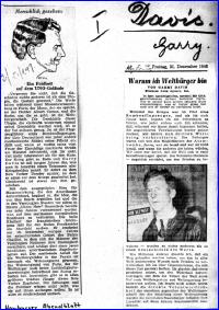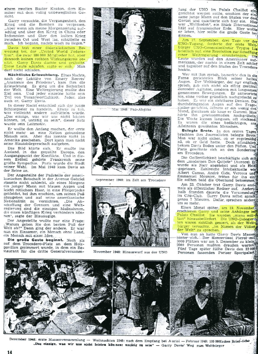 | Ein wenig Hoffnung - Weltbürger Garry Davis  Spiegel-Ausgabe vom 02. 04. 1949 (Nr. 14) Titelseite mit Garry Davis, Robert Sarrazac, Albert Camus und anderen Weltbürgern beim Verteilen von Flugblättern vor dem UNO-Gebäude anläßlich der Besetzung durch die Weltbürgerinitiative. Spiegel-Ausgabe vom 02. 04. 1949 (Nr. 14) Text 1  | ||||||||