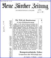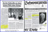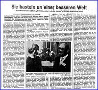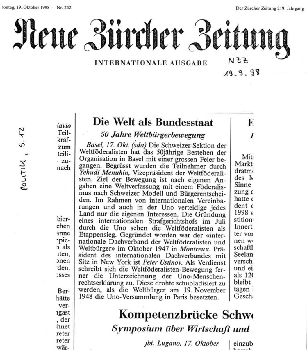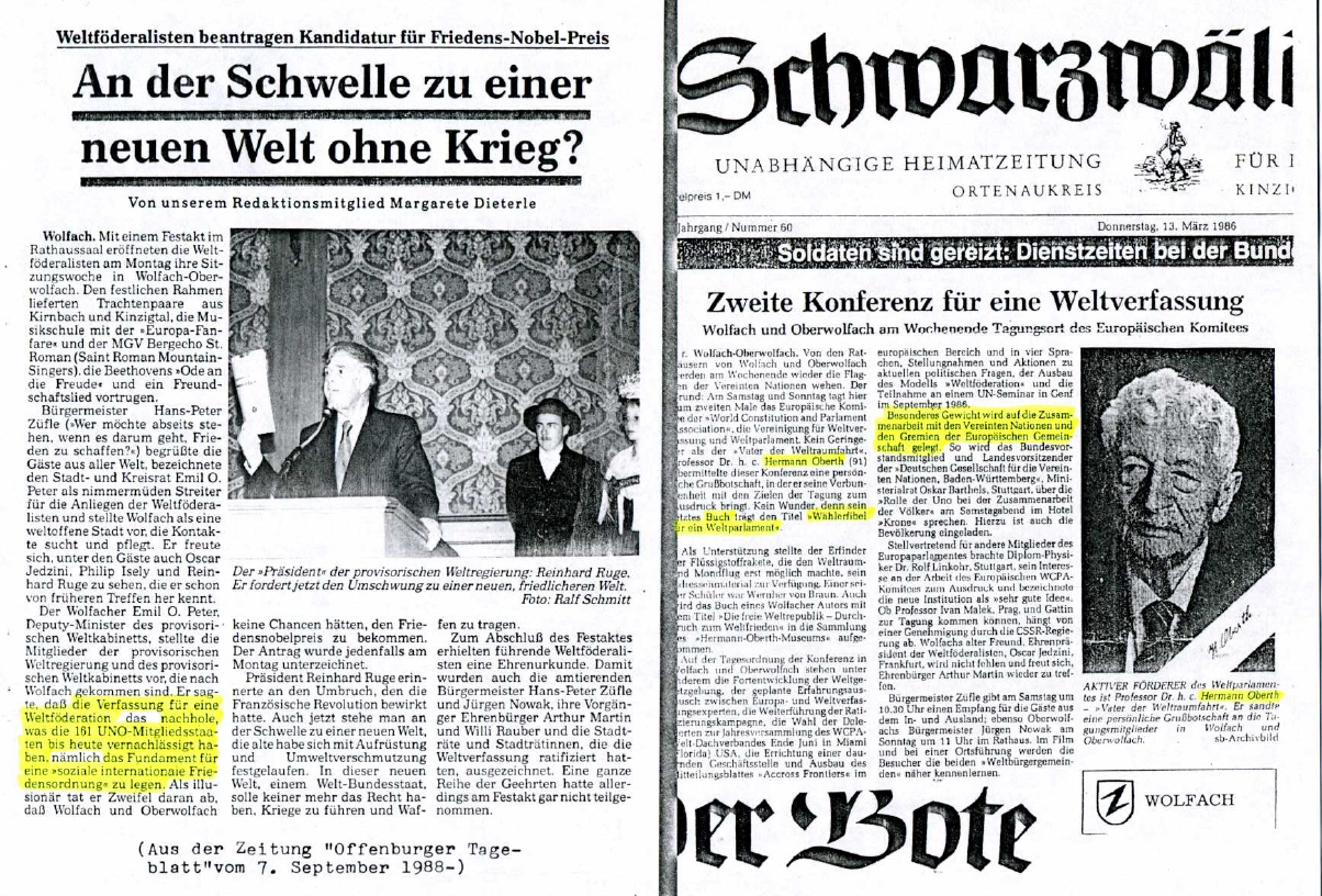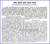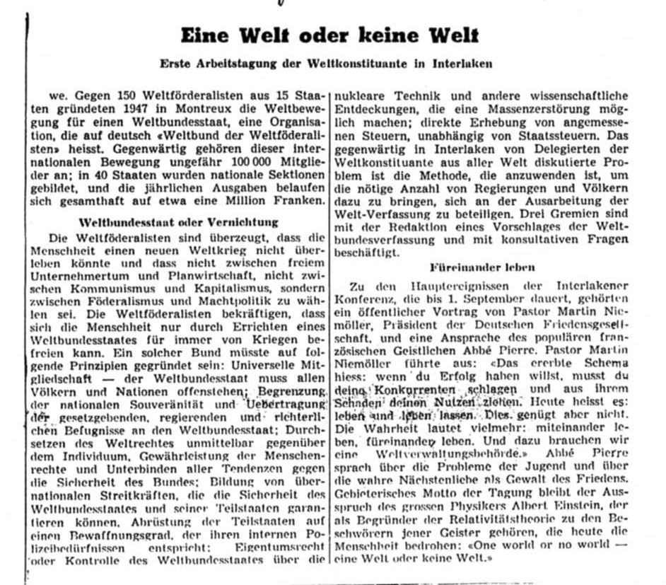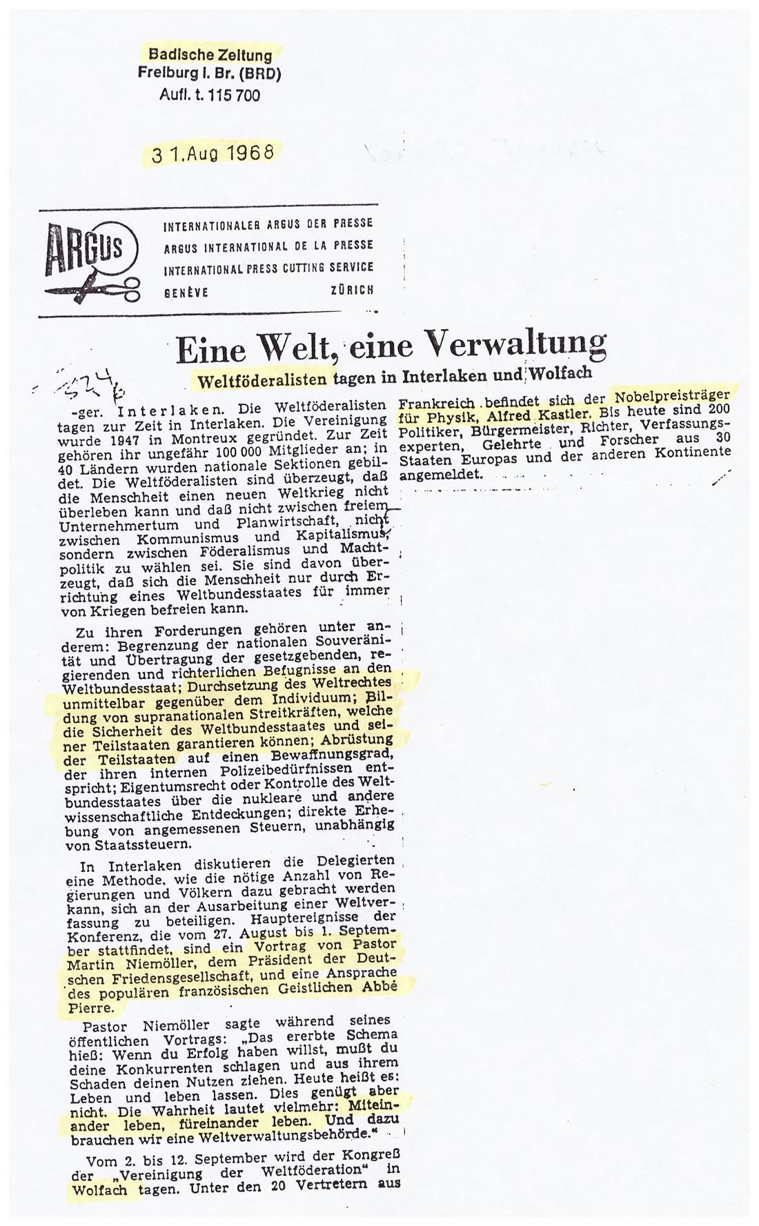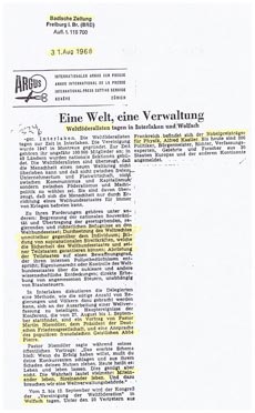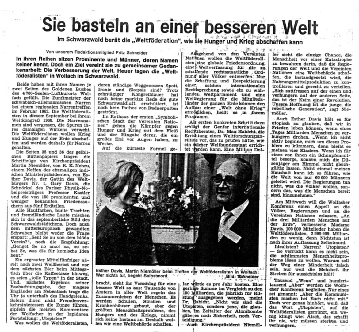 | "Eine Welt oder keine" - erschienen im Berner Tagblatt am 31. August 1968  Unten links: An der Schwelle zu einer neuen Welt ohne Krieg erschienen im Offenburger Tagblatt am 07.September 1988 Sitzung des Weltverfassungs-gebenden Arbeitskomittees der Welt-Föderalisten in den beiden mundialisierenten Gemeinden Wolfach und Oberwolfach mit Unterstützung des Stadt- und Kreisrates.   "Zweite Konferenz für eine Weltverfassung" erschienen im Scharzwälder Boten am 13. März 1986 In Zusammenarbeit mit der Deutschen Gesellschaft für die Vereinten Nationen, Landesverband BW, fand eine Tagung zur Weiterentwicklung des Weltverfassungs-Entwurfes von 1968 in Wolfach statt. Der Vater der Weltraumfahrt in Deutschland, Prof. Hermann Oberth, Autor des Buches "Wählerfibel für ein Weltparlament" sandte zur Eröffnung eine Grußbotschaft. | Sie basteln an einer besseren Welterschienen in der Schwarzwälder Zeitung / Bote am 10. September 1968 Das Foto unten zeigt Esther Davis zusammen mit Martin Niemöller, damals Beiratsmitglied der Weltbürger- und Weltföderalisten-Bewegung, sowie Präsident des Evangelischen Kirchentages  "Die Welt als Bundesstaat" erschienen in Neue Züricher Zeitung am 19. September 1998 30 Jahre nach der Weltverfassungs-gebenden Versammlung in Interlaken und 50 Jahre nach der UNO Besetzung. In der Regel finden ca. alle 10 Jahre in der Schweizer Föderation internationale Treffen der Weltbürger und Welt-Föderalisten statt.  | |||||||