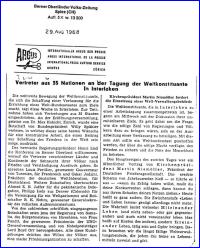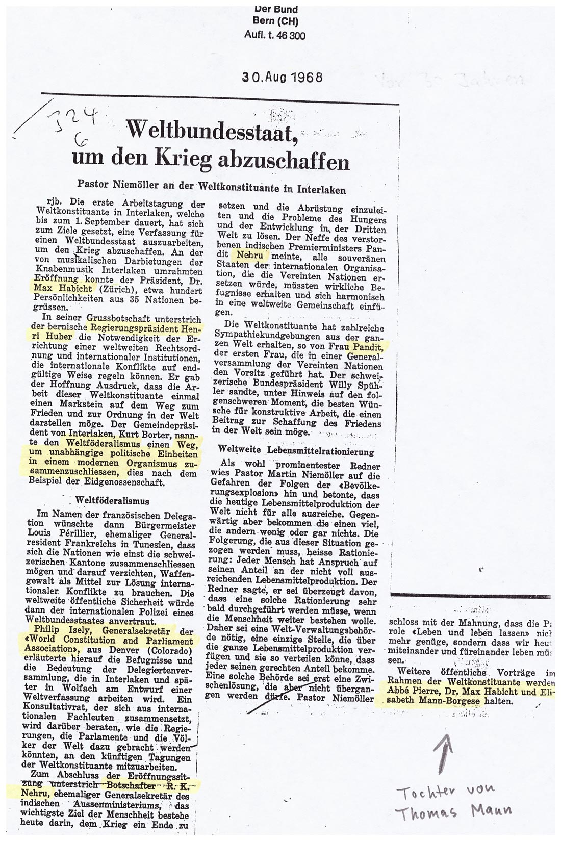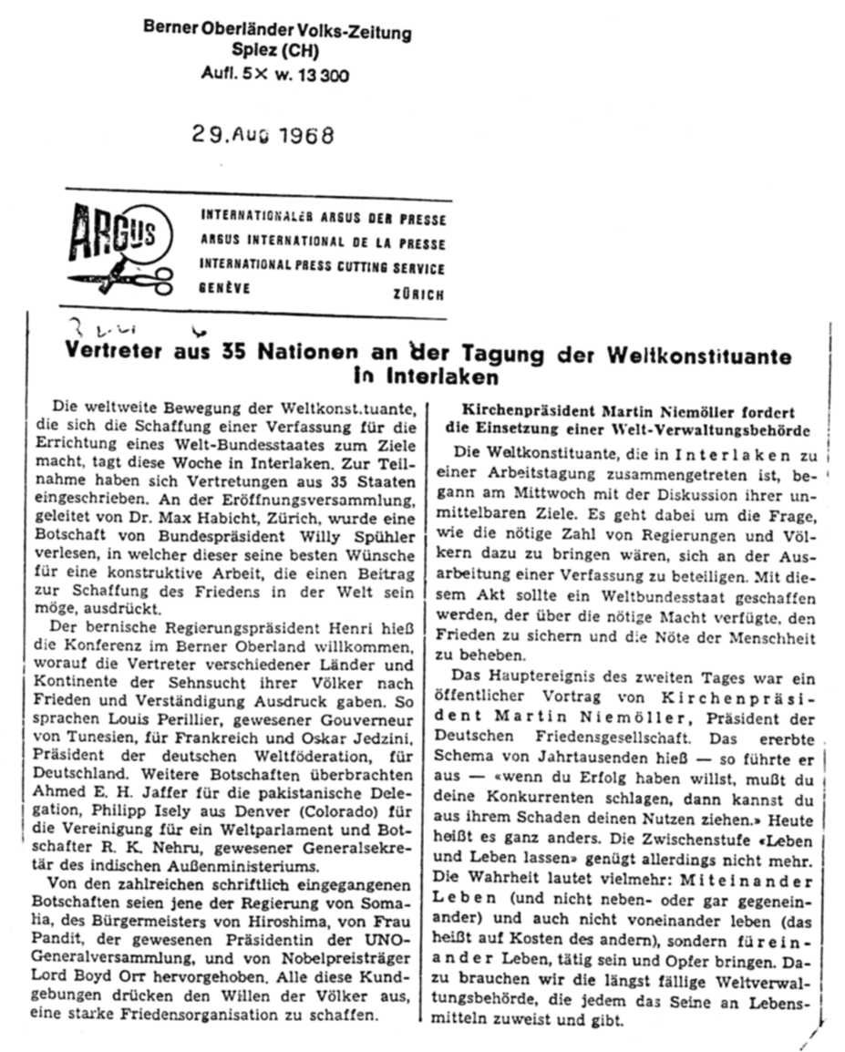 | Tagung der Weltföderalisten zur Weltkonstitunante in Interlaken Ende August 1968. Treffen führender Pesönlichkeiten aus der Weltbürgerbewegung zu einer Weltverfassungs-gebenden Versammlung ("Weltkonstituante") in Interlaken, Schweiz, darunter Martin Niemöller, Elisabeth Mann-Borgese (Tochter von Thomas Mann & Autorin des CoR-Berichtes "Die Zukunft der Weltmeere"), Dr. Max Habicht (Jurist aus Genf), R.K. Nehru (Neffe des indischen Ministerpräsidenten und ehem. Generalsekretär des indischen Aussenministeriums) u.v.a. mehr. | ||||||||