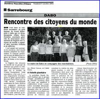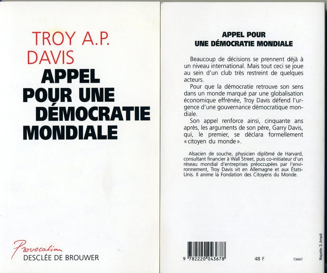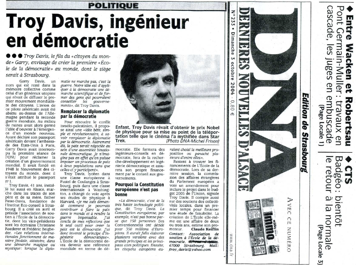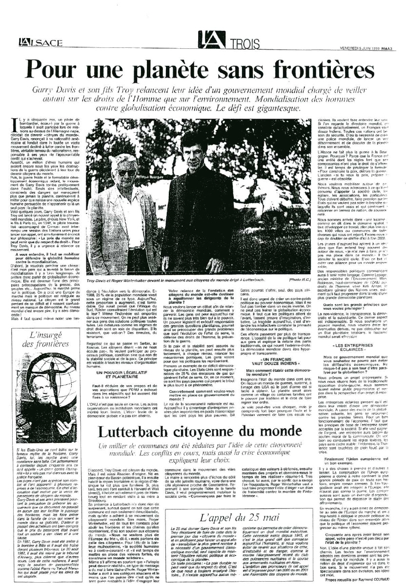 ![]() "Pour une planete sans frontieres"erschienen in der Zeitung ALSACE am 05. Juni 1996 "Für einen Planeten ohne Frontlinien" Troy Davis, Vorstandsvorsitzender der Weltbürgerstiftung und Leiter des EU-Büros der Weltbürgerbewegung beim EU-Parlament in Strasbourg, zusammen mit dem Bürgermeister der mondialisierten Stadt Lutterbach, Roger Winterhalter. |