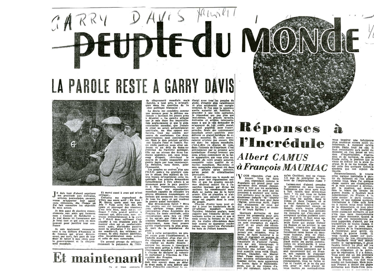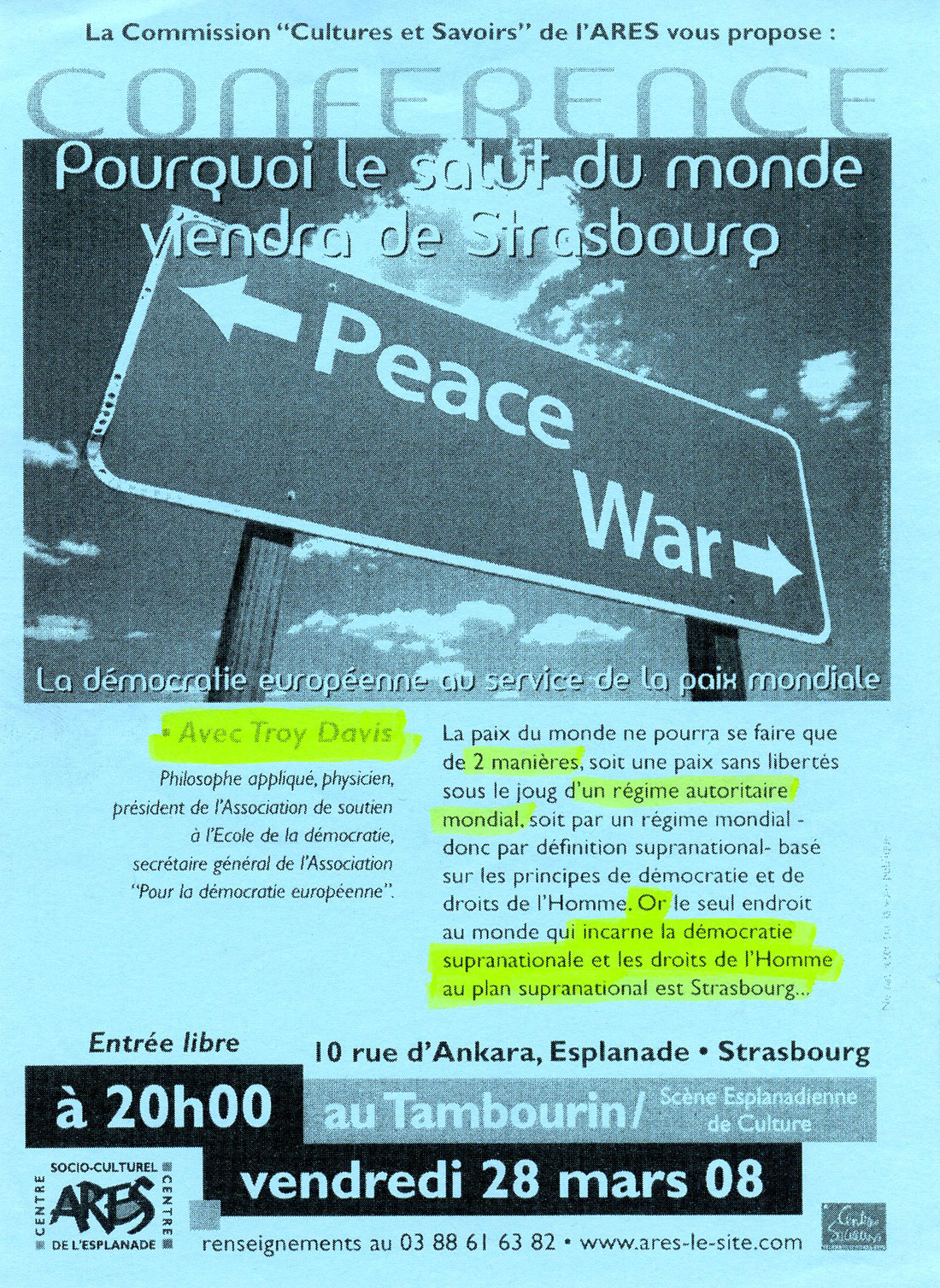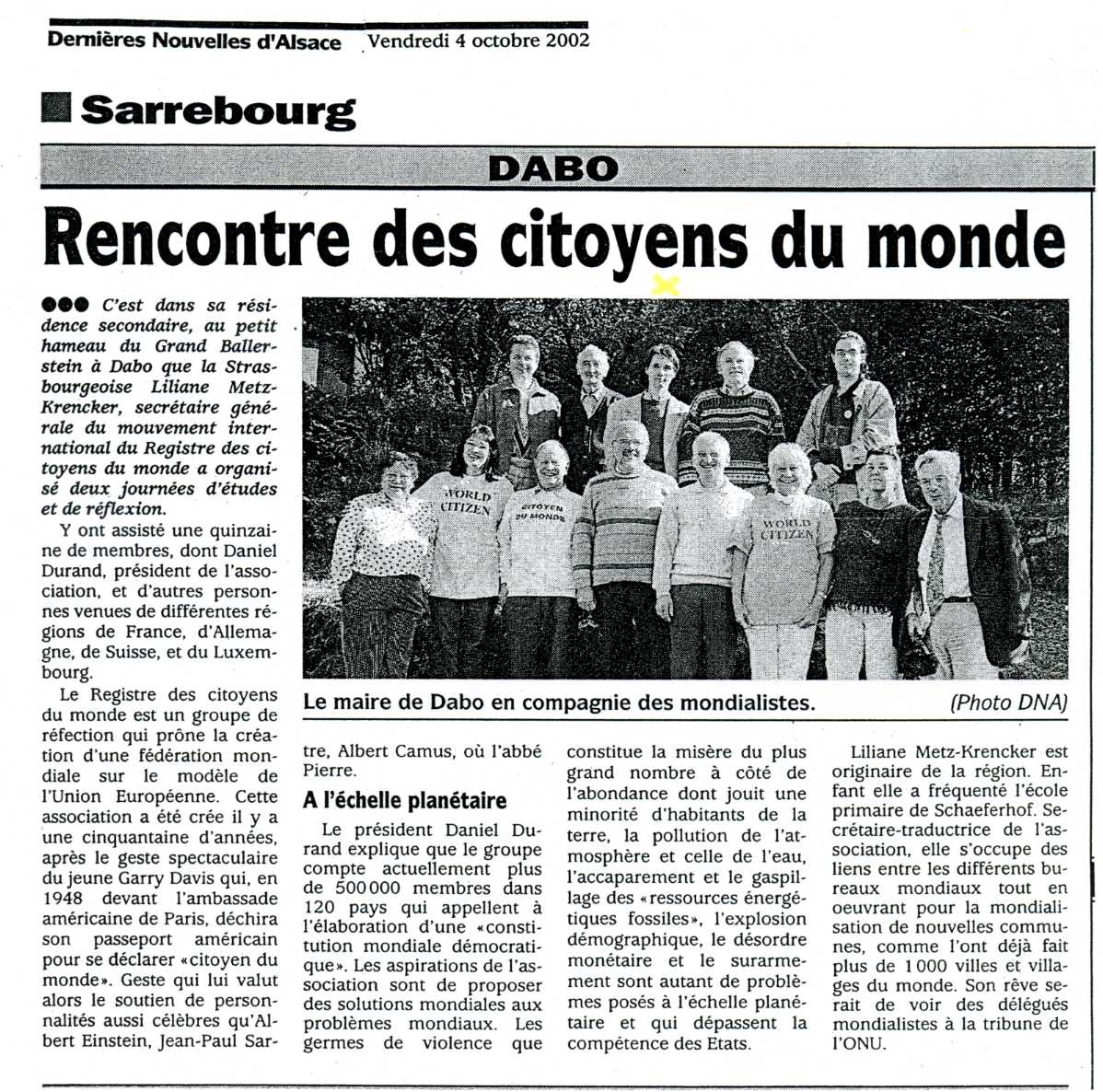 ![]() "Pour une planete sans frontieres"erschienen in der Zeitung ALSACE am 05. Juni 1996 "Für einen Planeten ohne Frontlinien" Troy Davis, Vorstandsvorsitzender der Weltbürgerstiftung und Leiter des EU-Büros der Weltbürgerbewegung beim EU-Parlament in Strasbourg, zusammen mit dem Bürgermeister der mondialisierten Stadt Lutterbach, Roger Winterhalter. |