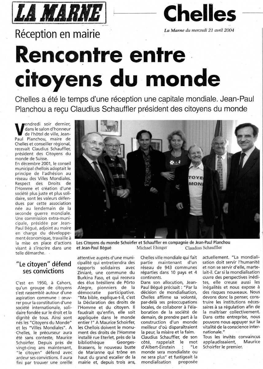 ![]() Recontre entre citoyens du mondeerschienen in LA MARNE am 21. April 2004 Besuch einer Weltbürgerabordnung beim Bürgermeister der mondilalisierten Weltbürgerstadt in Chelles. Seit den 50 er Jahren haben sich weltweit Städte als atomwaffenfreie Weltbürger-Terretorien deklariert (mondialisiert). |