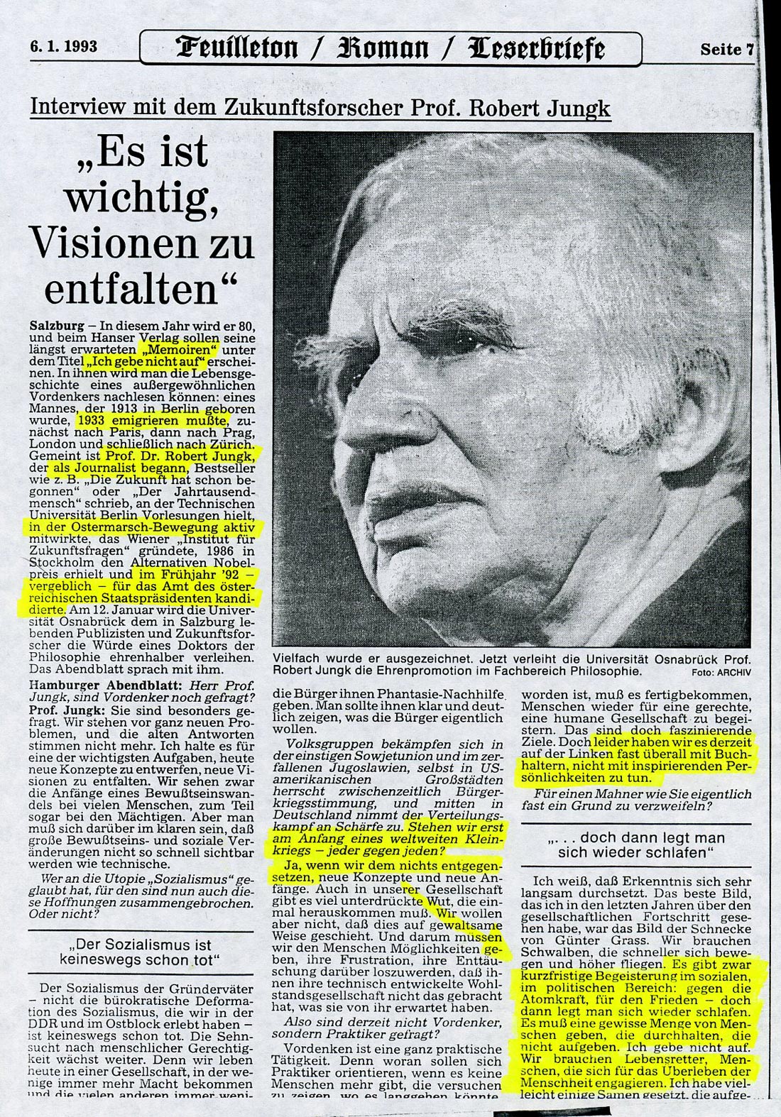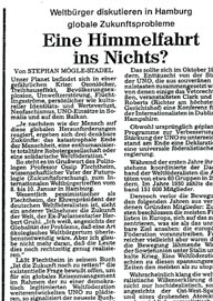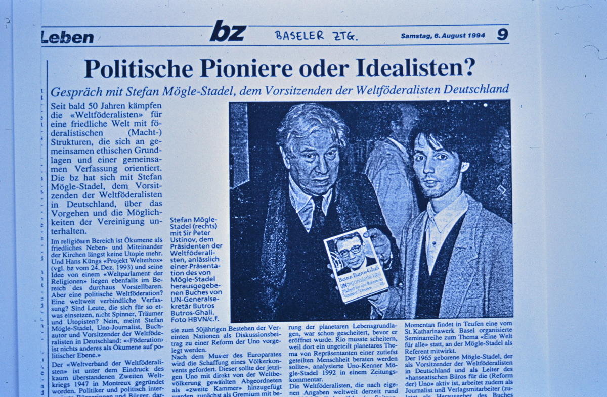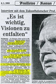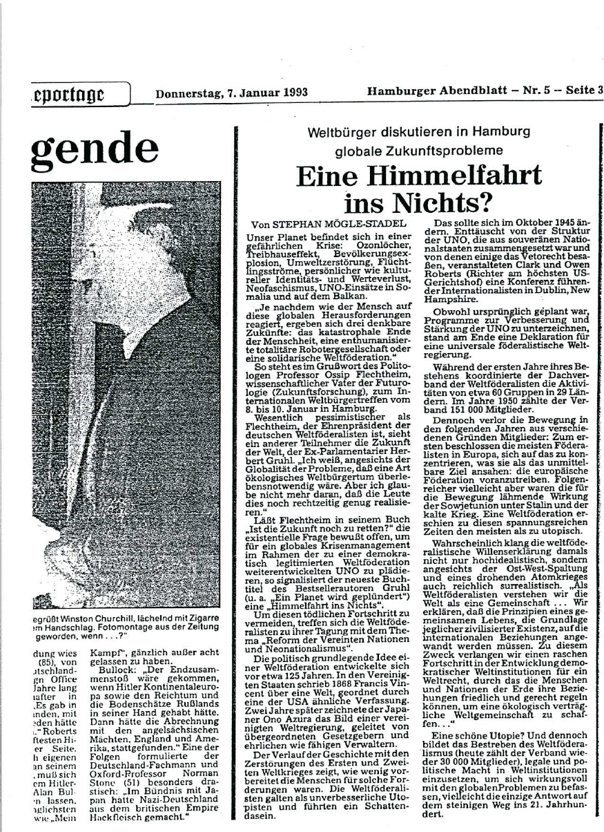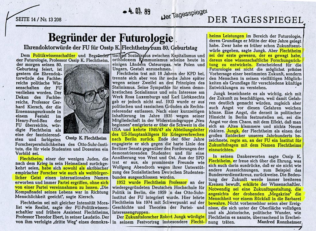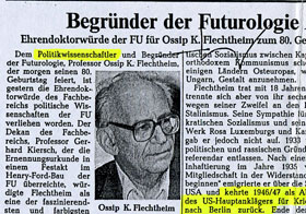 | O. Flechtheim - Begründer der Futurologie Portrait im Tagesspiegel Berlin, 04.03.1989 ![]() A Prof. Dr. Dr. Ossip K. Flechtheim war von Ende der 80er Jahre bis zu seinem Tod der Ehren-präsident der Weltföderalisten & Weltbürger-Vereinigung WFM-Germany e.V. Link: Unterseite zu Leben & Werk Flechtheim Link: Stephan Mögle-Stadel (Link anklicken) |