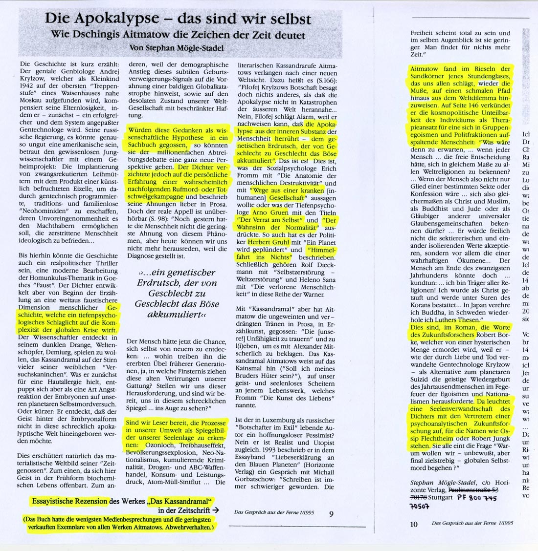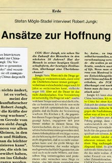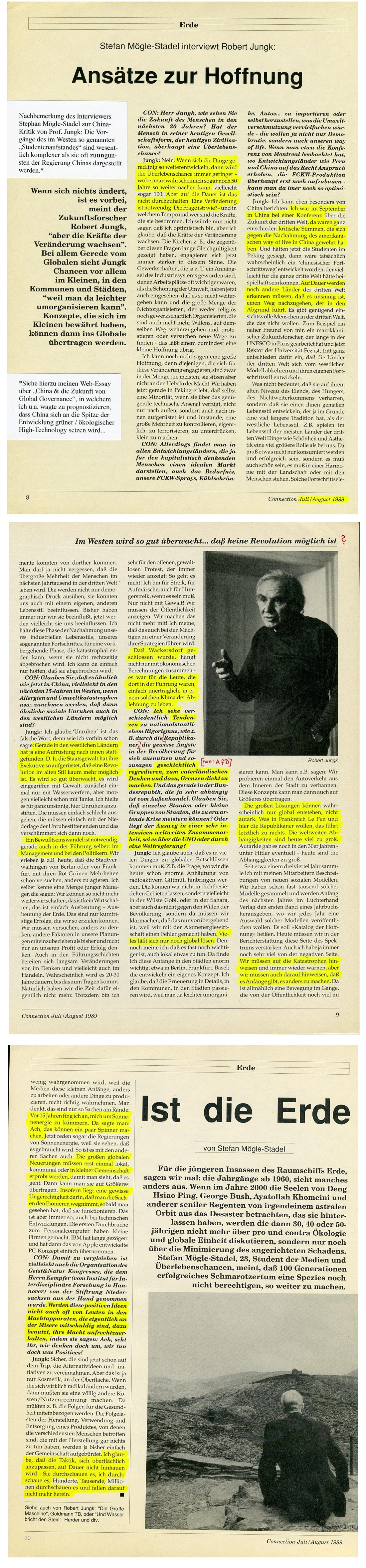 ![]() Titel-Story-Essay zu der TV-Diskussions-Reihe "Ist die Erde noch zu retten ?" von S. Mögle- Stadel in der Zeitschrift Connection, Juli 1989 Hier der Essay als ganze PDF Der für den Vorspann zuständige Redakteur hat in Unkenntnis der chinesischen Geschichte irrtümlich Deng Hsiao Ping mit George Bush verglichen. DHP ist ein weitaus größerer Staatsmann, dem China seinen Aufstieg zur Weltwirtschaftsmacht verdankt. Das 1989 nicht abgedruckte Ende des Essays (Bitte Link anklicken) |
