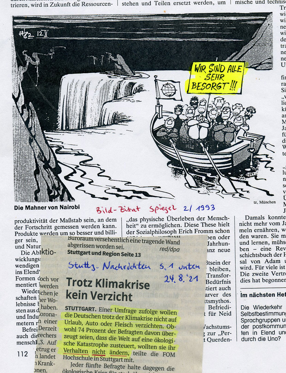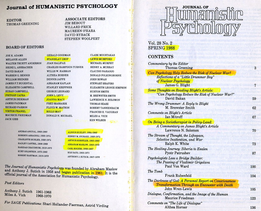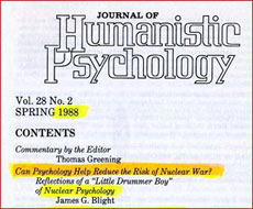 ![]() Appell zum Weltklima-Gipfel 2021 in Glasgow "Last uns die letzte Chance ergreifen" (Polit-PR & Bla Bla Bla) Rechts: Journal of Humanistic Psycho- logy 1988 über die Psychopathologie des atomaren Krieges (Link) "Kann Psychologie dabei helfen das Risiko eines Atomkrieges zu reduzieren?" "Und die Antwort ist leider Nein." (SMS) Psychohistorie kann einige wenige Menschen darauf vorbereiten (zu überleben), aber den Suizid der Spezies "Sapiens" nicht verhindern |