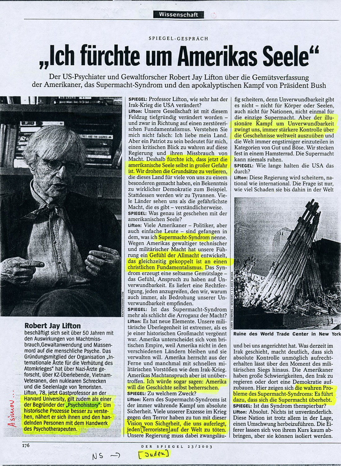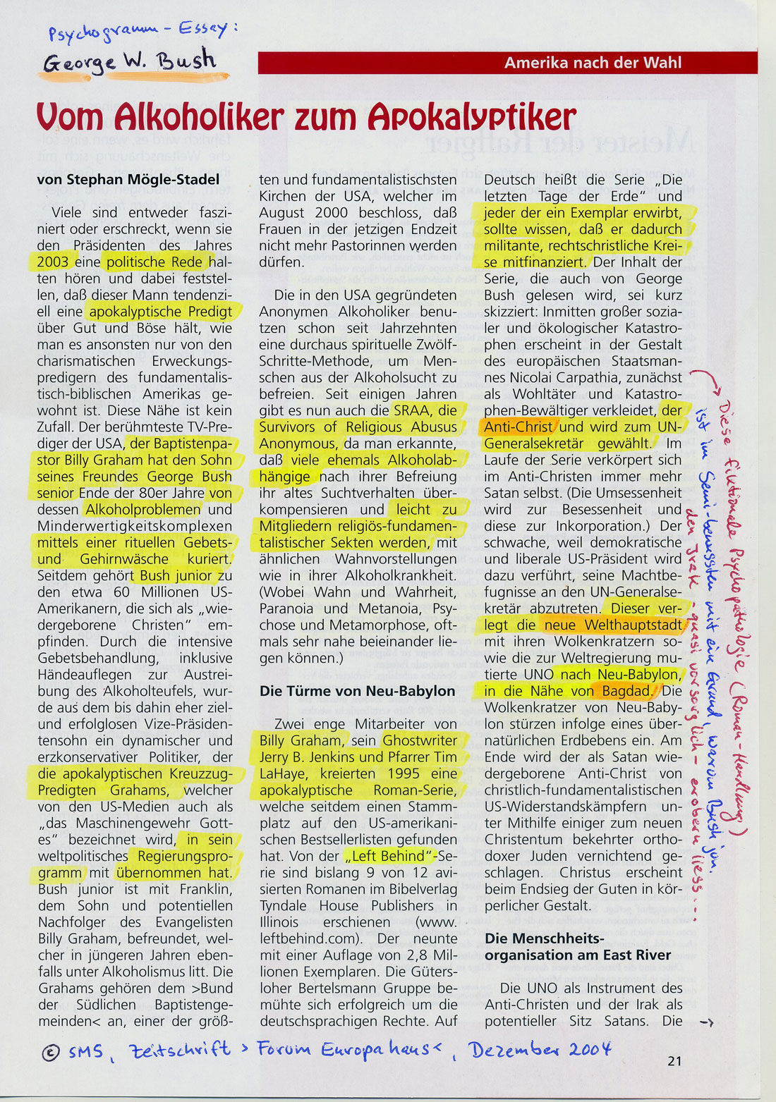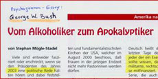 ![]() Psychogramm des evangelikalen US- Präsidenten Georg W. Bush (Link) Psychoanlytische Motivation, den Irak anzugreifen. |