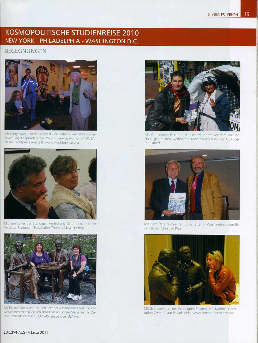 | 8. Tag (Mo.): Treffen mit David Gallop oder anderem Repräsentanten des WSA-World Office in Wash. DC sowie Treffen mit Scott Hoffman oder anderen Repräsentanten der Welt- Föderalisten (Lobby-Büro für den US-Kongress); Besuch einer öffentlichen Sitzung im US-Kongress, in einem Komitee (Hearing), Abgeordneten-Büro oder im US-Senat. |