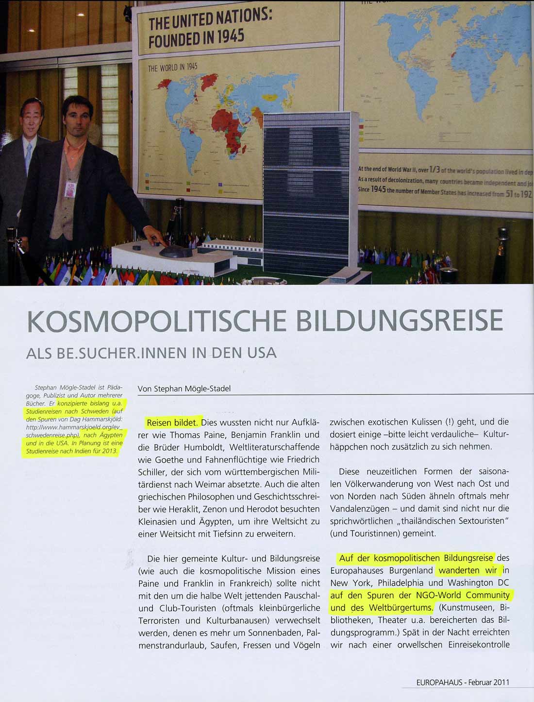 | 2. Tag (Di.): Treffen mit dem Begründer der Weltbürgerbewegung (WSA) in New York City oder in South Burlington, Vermont VT 05407 (ca. 2 Autostunden von NYC); Führung durch das UNO-Gebäude und die UNO-Gartenanlage (Anti-Kriegs-und-Folter-Skulpturen) mit Stephan Mögle-Stadel, kritischer UNO-Buchautor und Vorstandsmitglied der Weltbürgerstiftung; Abend zur freien Verfügung. |