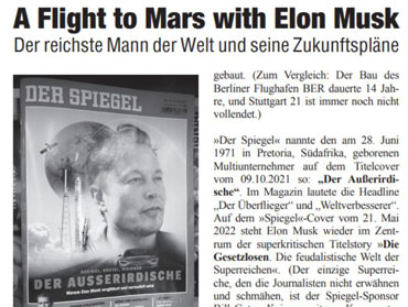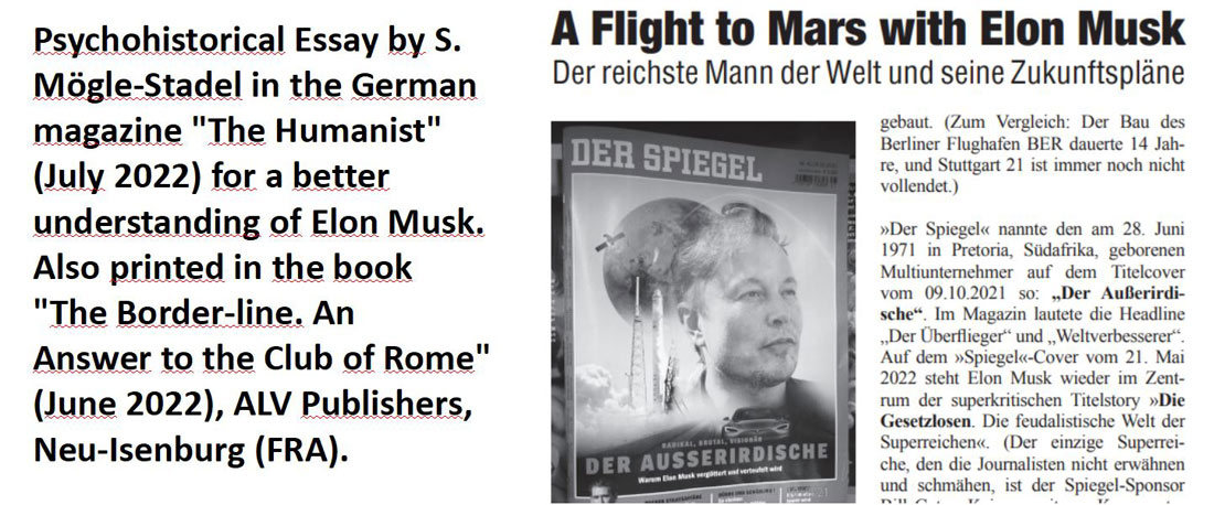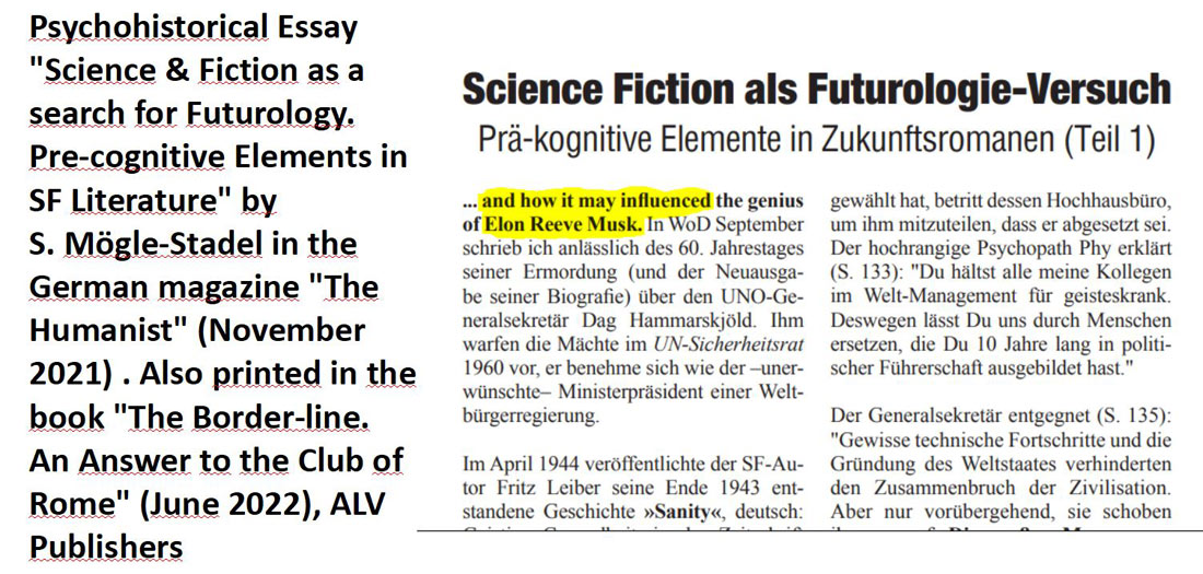 The lecturer Stephan Moegle-Stadel, studies in psychology & history, educator and Co-chair of the small  World Citizen Foundation, explains the early influences of Science & Fiction of the genius inventeur and entrepreneur Elon Reeves Musk. | |||||||||||||||||||||||||||||||||||||||||||||||||||||||||||||||||||||||||||||||||||||||||||||||||||||||||||||||||||||||||||||||||||